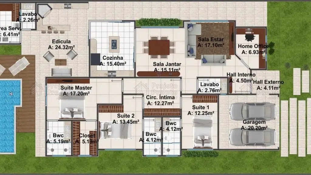 ****15 Ce plan d’étage a 146 m² (11,3 x 16,5 m) avec un style plus traditionnel. Il dispose d’un garage pour deux voitures, d’une cuisine fermée et d’une salle à manger intégrées dans le salon. La circulation relie la salle de bains avec 3 chambres, étant une suite. Excellente option pour ceux qui veulent combiner fonctionnalité, confort et beauté en un seul projet.
