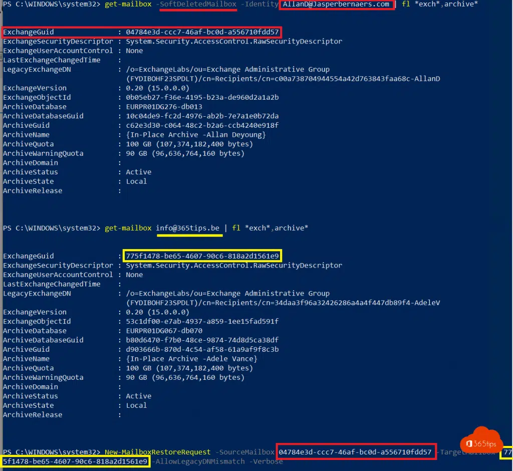 New-MailboxRestoRequest -SourceMailBox 04784e3d ccc7-46af-bc0d-a556710fdd57 -targetMailbox 775f1478-be65-4607-90c6-818a2d1561e9 -AllowLegacydnMcorrespondance -Verbose